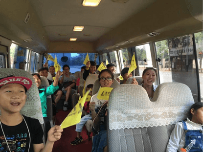 踏上归程,孩子们都很尽兴地挥舞着他们的队旗——老虎游爱之旅专用小旗