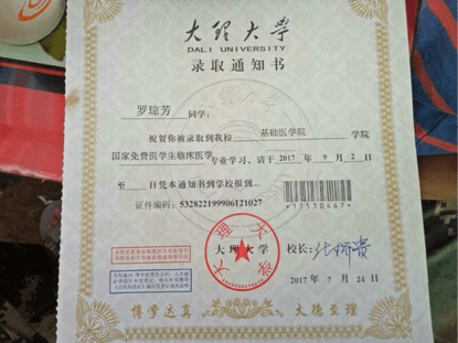 2017年8月20日,家住西双版纳州勐海县勐宋乡糯有村的罗琼芳收到了大理大学的录取通知书,成为该村有史以来的第一位读本科的大学生。