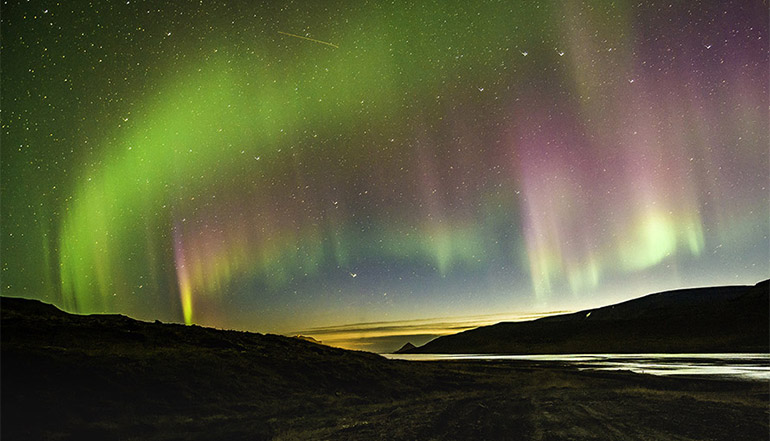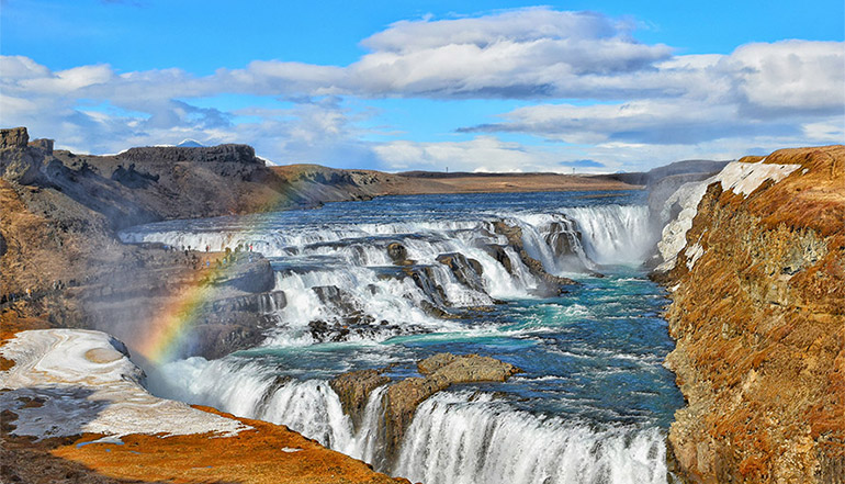 【黄金瀑布】,彩虹经常横跨在这座冰岛最大的断层峡谷瀑布之上,虹桥炫美,水流奔腾,一动一静,美得令人感动。观瀑之后,如愿意,还可以跟随专业向导深入朗格冰川,乘坐雪地摩托,体验一把“雪上飘”刺激。