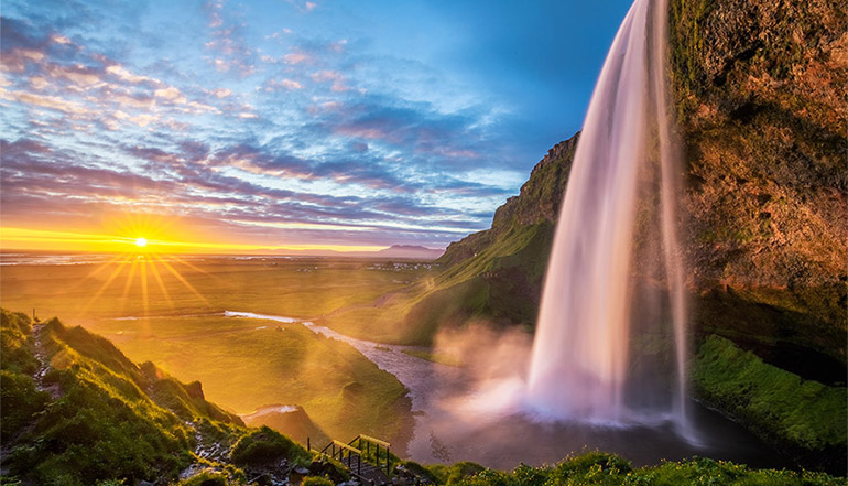 【塞里雅兰瀑布】塞里雅兰瀑布高达63米,是冰岛最高的瀑布之一,由于瀑布本身位于高处,前方又是一片开阔的平原,晴天时,明媚的阳光便可无遮无拦地洒过来,不断坠落的水帘幕中的每一滴水珠都被照得熠熠生辉,游人可以顺着小路走到水帘背后,静静欣赏这动人的一幕。