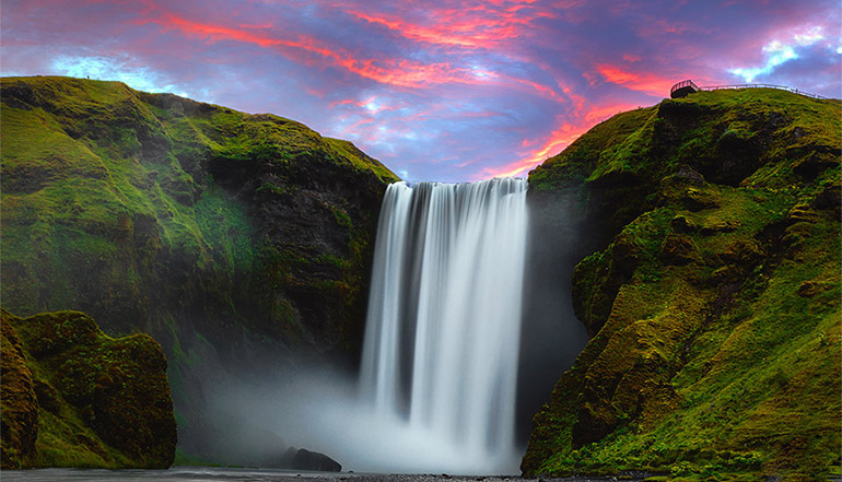 【斯科加瀑布】又名森林瀑布,宽20米,高60米,你可以登上瀑布之巅,在轰鸣水声的伴奏下,遥望冰岛南岸海岸线。