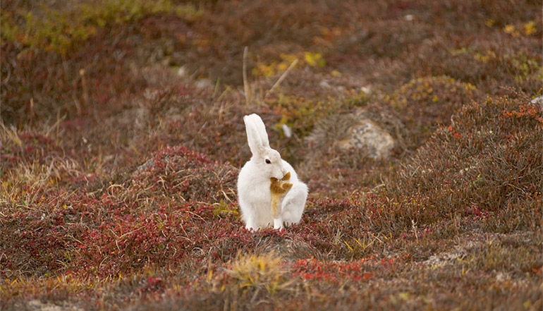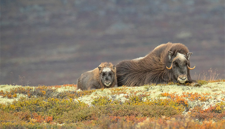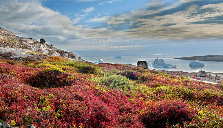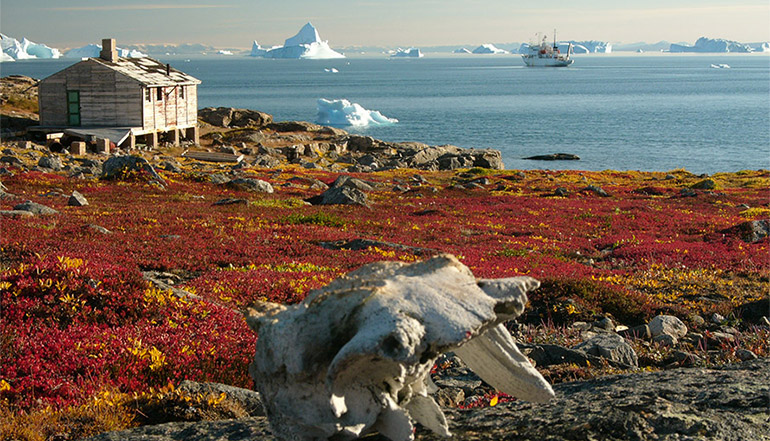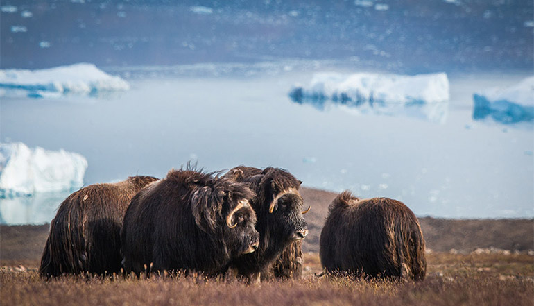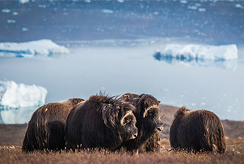 在【霍夫曼哈沃角】前的海面上航行时,可以欣赏静静漂浮在海面上的冰山的千姿百态,找寻潜水高手鲸鱼,看空中自由的岩雷鸟飞来又飞去。登陆后,我们将漫步这片神奇的土地,路过生长在冻土荒野上的顽强植物,采撷色味皆迷人的北极蓝莓与岩高兰浆果,邂逅在交配季节便会散发强烈气味的麝牛,这些敦厚沉默的生灵头顶宽宽巨角,身披向下斜长以便积雪滑落的厚实毛发。晚上途径【红峡湾】。这是一个被冰川和海豹占据的峡湾,峭壁和海岸上有着丰富的植物,千千万万只北极海鸟就在这儿的峭壁上安家落户。