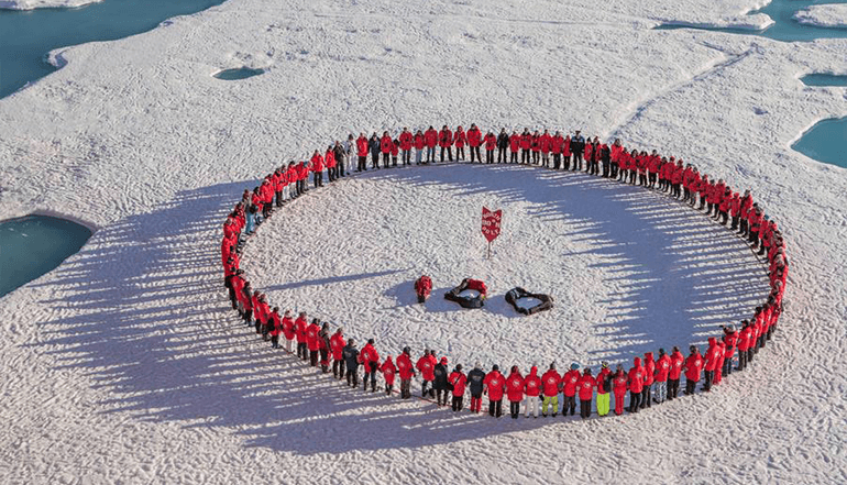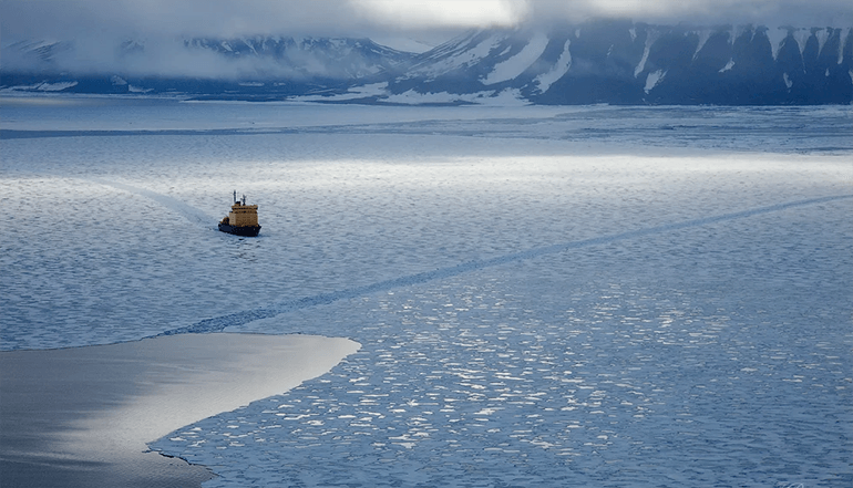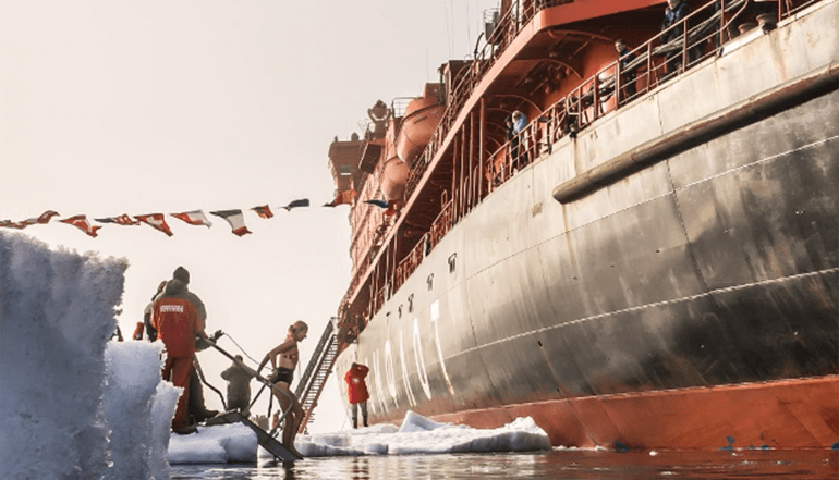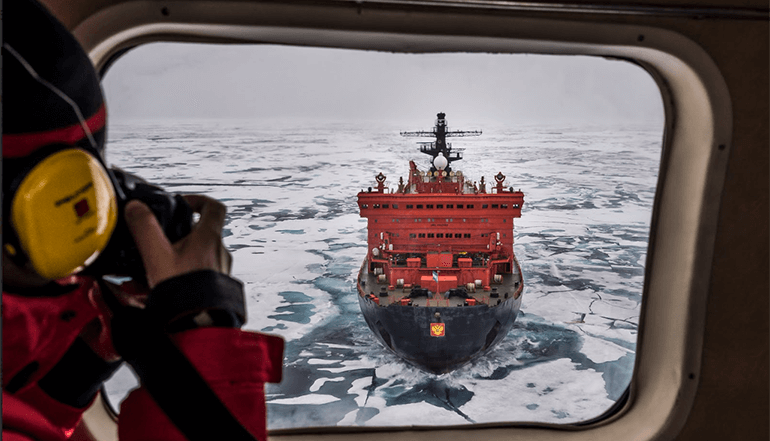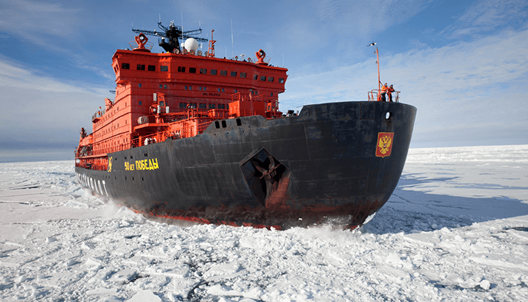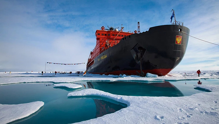 50年胜利号是一艘史诗级的核动力破冰船,18节的航速,2.5万吨的重量足以压碎两三米厚的冰层,抵达任何一艘船都无法抵达的北纬90度。