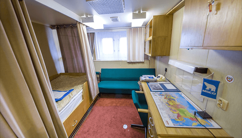 所有船舱均可看见外景,并提供丰富的私人设备,有的客舱甚至配有咖啡机。北极套房是50年胜利号最高端的套房,拥有豪华舒适的大床房,舒适的沙发床,外加最好的观景视野。