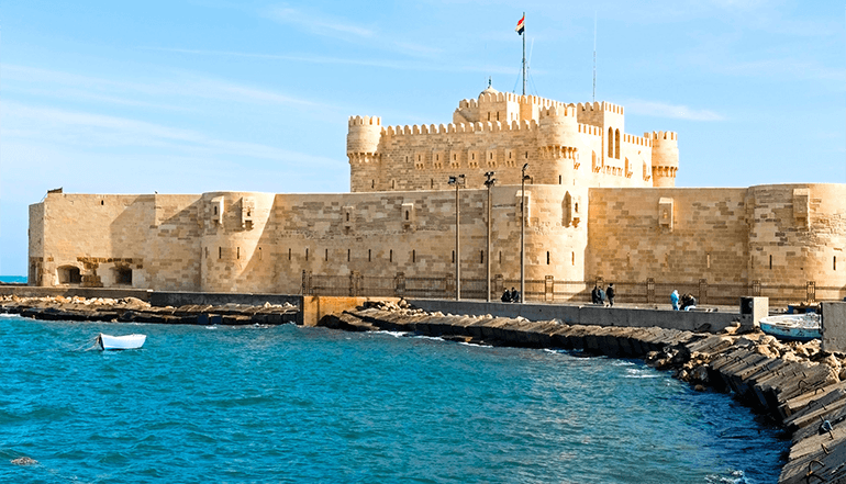 公元1480年,为防止土耳其入侵,埃及国王凯特贝命令用亚历山大灯塔遗址的石料在灯塔原址修筑城堡,并以自己的名字命名,这就是现存完整的【凯特贝城堡】。城堡是一座长方形阿拉伯式建筑,占地2万平方米,三面为高大的城墙,顶部有一个海神的雕像,造型优美,气势巍峨,与开罗古城堡并称为埃及两大中世纪古城堡。如今城堡已成为亚历山大市的一个标志性建筑物,现在城堡的房屋已经成为一个清真寺和博物馆,从这里可以欣赏到城市和地中海绝美的景色。