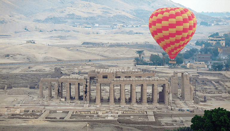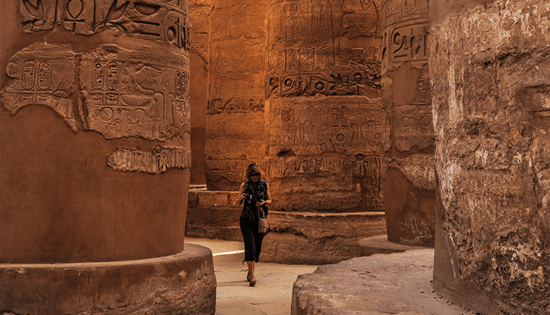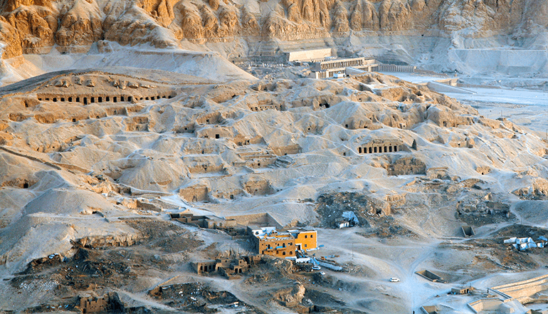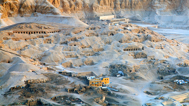前往卢克索,参观位于尼罗河西岸离古城底比斯遗址不远的一片荒无人烟的石灰岩峡谷中的【帝王谷】。因为金字塔频频被盗,自公元前1539年起,古埃及的法老们就不再建造金字塔,而是选择在这个山谷中的地下深处,建造法老的陵墓。这里有一座山峰很像金字塔,法老们认为,葬于此地,自己的木乃伊既能埋于山谷的深处,谢绝一切盗墓贼,又能使自己的灵魂从天然“金字塔”升入天堂,所以从图特摩斯一世开始的五百多年里,一代又一代,有64个法老都把陵墓秘密地建造在这个特殊的山谷里。这个看似普通的山谷就这样,成为了帝王谷。