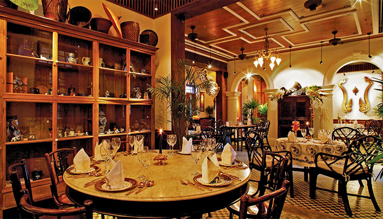 晚餐则安排在当地米其林三星餐厅【蓝象】。精美的铜制餐具、清爽的盆栽花木、绿白相间的地砖、新古典主义的柚木家具、别致文艺的灯饰壁挂、绝对优质新鲜的食材以及泰国皇家顶级料理,这一切的总和就是精致奢华的蓝象。此外,蓝象所在的Phra Pitak Chinpracha大厦,前身为总督府,是一栋有着105年悠久历史的大楼,坐在这样拥有属于“另一个年代”的中葡风格的餐厅里品尝名字前冠以“古法”字样的菜肴(这表示烹饪这道菜的技法本已失传,经过餐厅行政主厨 Nooror 之手才得以重现),无疑是非常独特的体验。
